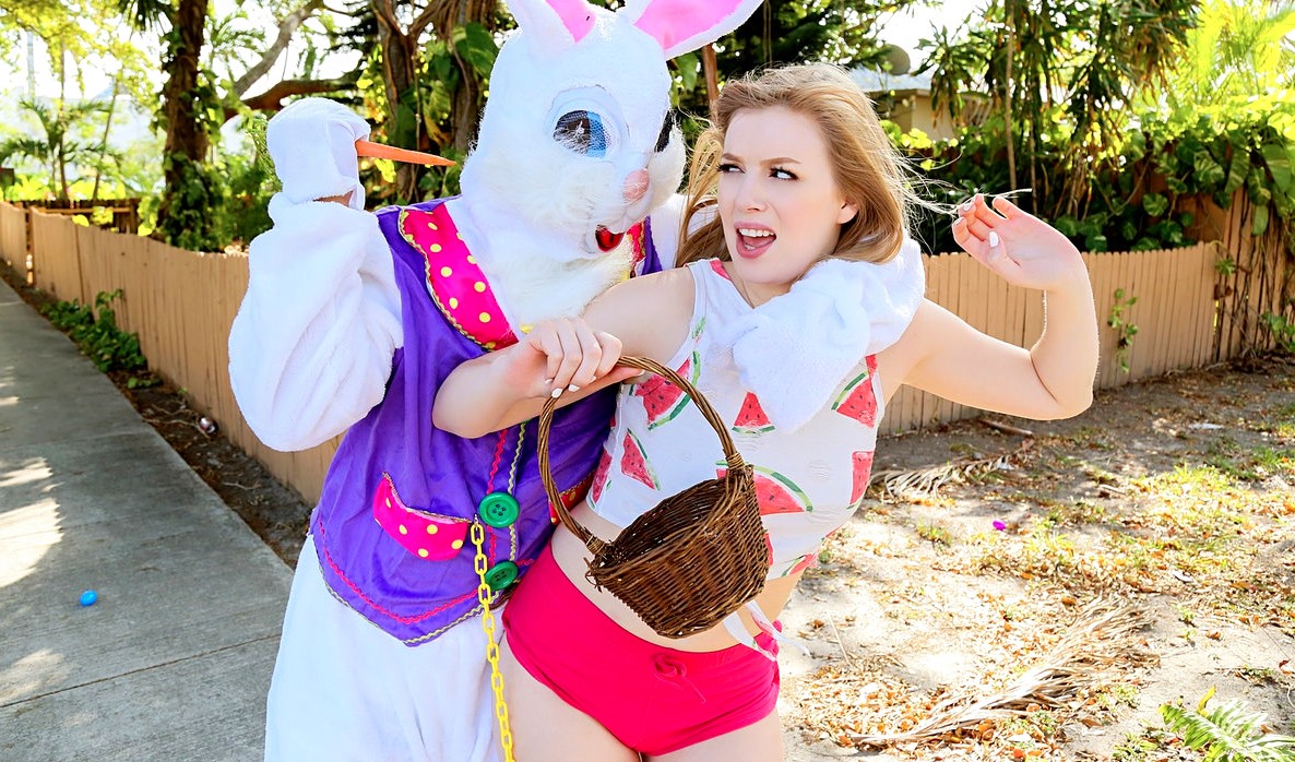 Вообще бешеные кролики – это редкость. Но если не симпатичную девушку напал мужик в костюме зайца, а другой кент заступился за мадемуазель – это отличный повод для девушки пригласить заступника к себе домой и там отблагодарить классным сексом на кровати. Красотка так и делает к взаимному с парнем удовольствию.