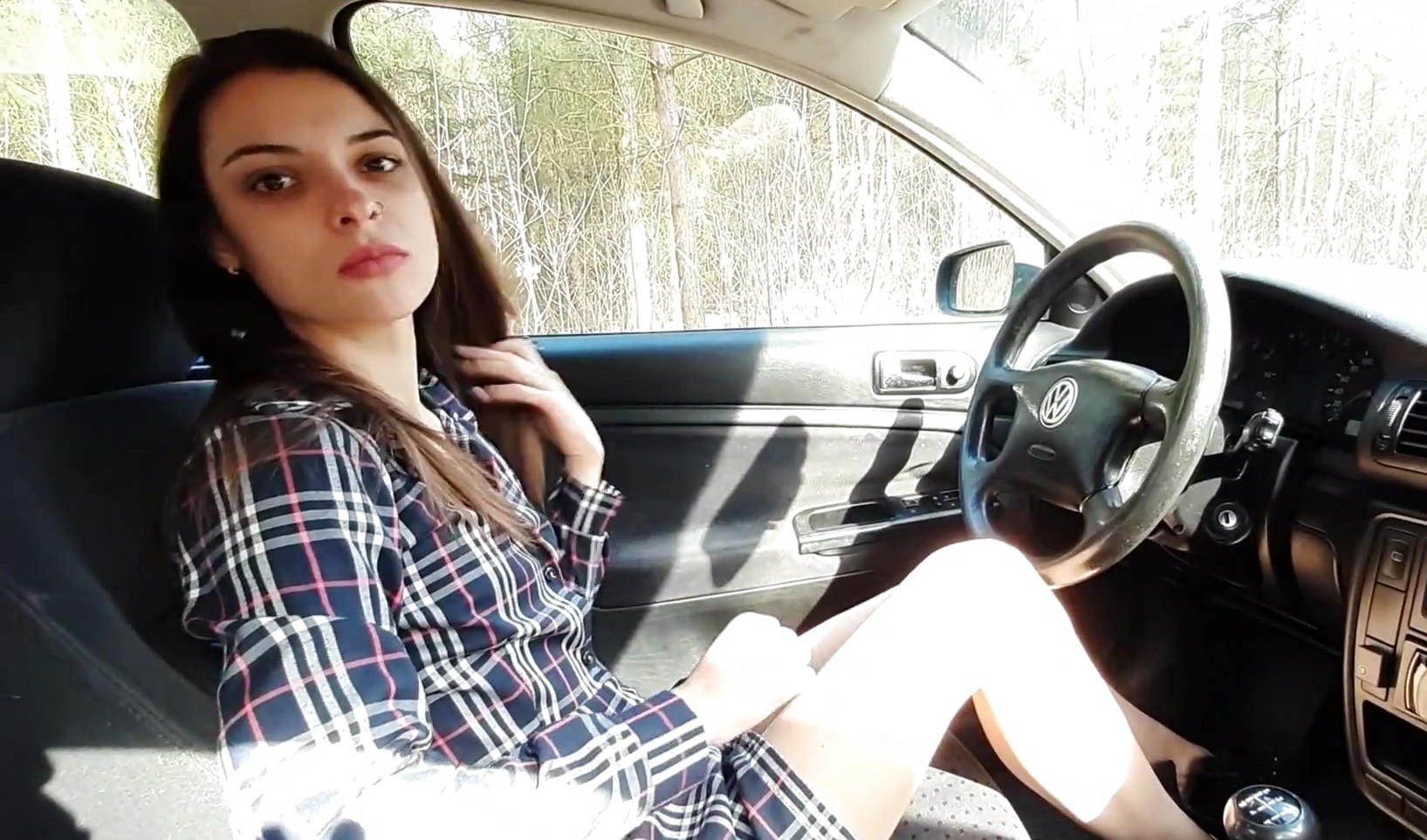 Ну вот если вождение в индивидуальном порядке молодая русская девушка далеко не без помощи товарища освоила, то бурный секс в салоне машины пока что нет. Ну да никто не помешает ей сделать это сейчас и милашка охотно снимает труселя, чтобы подрочить шмоньку, взять в рот конец и сполна отблагодарить товарища за умелую учебу.