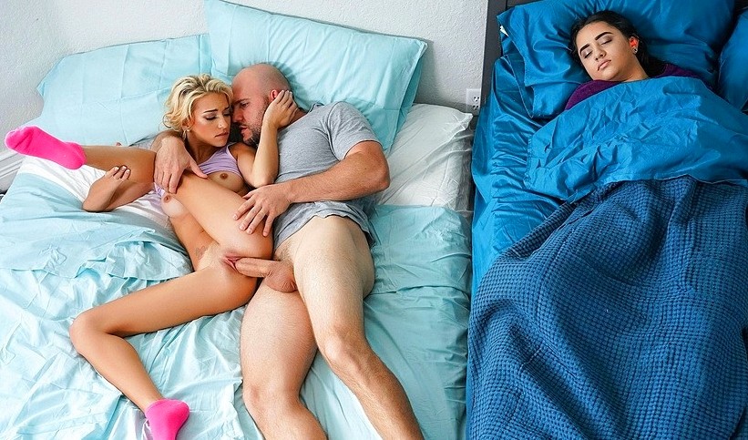 Блонда задержалась в гостях у семейной пары и натурально попросилась переночевать. Конечно ей никто не отказал. Но целью данной многоходовочки является секс со здоровенным хозяином квартиры, который поздней ночью вылезает из-под бочка спящей женушке, чтобы знатно отодрать горячую подружку практически на расстоянии вытянутой руки от супруги. Похоже в этой любовной парочке оба слегка больны на голову!